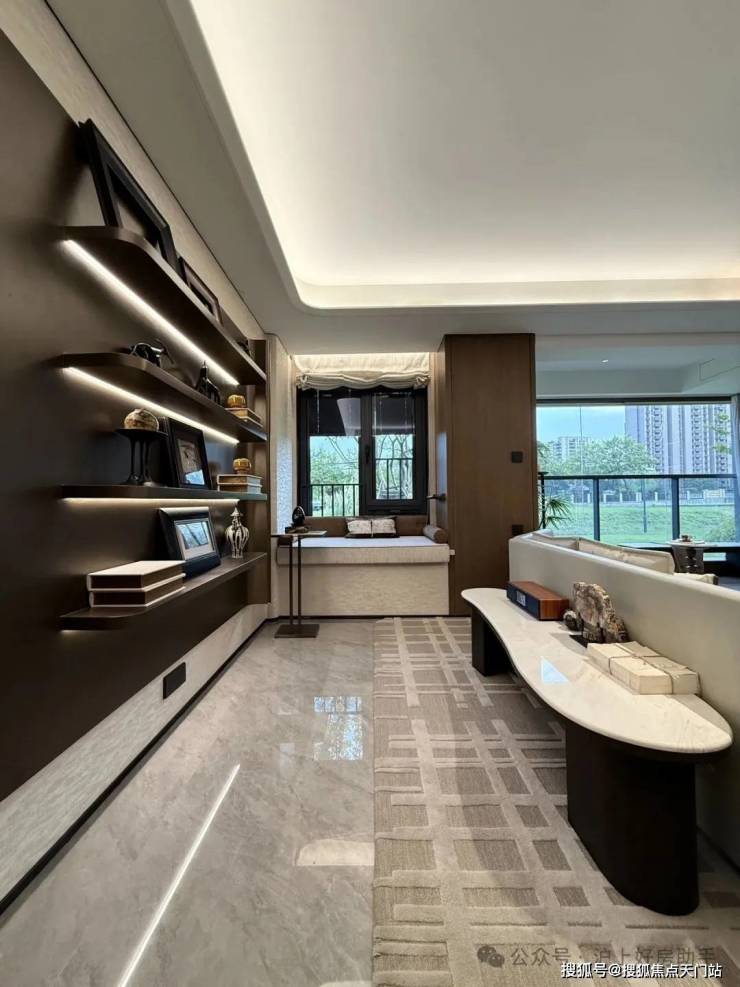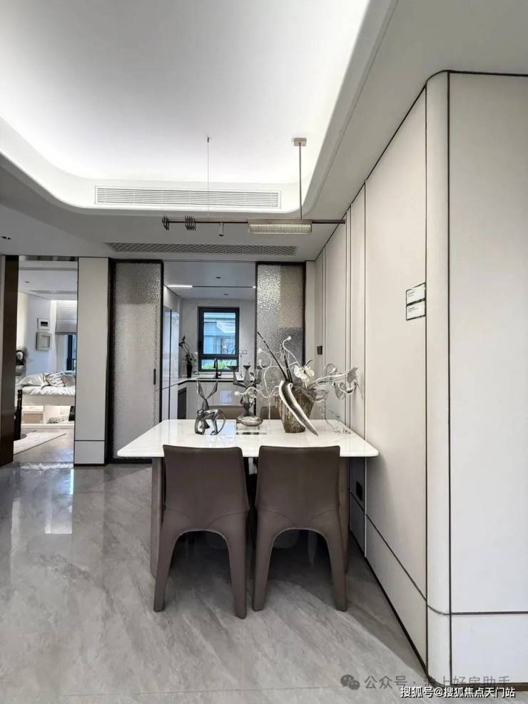 归家门厅设计为 弧形顶棚,非对称构图,圆润的形式提供给业主放松的情绪价值。可以说是处处体现人居的松弛感和舒适度。