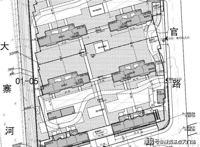 01-03(中间),规划10幢楼,其中一幢为保障房,总高17-18-20层,小区中心位置的商品一楼为架空层,南北楼间距30米。