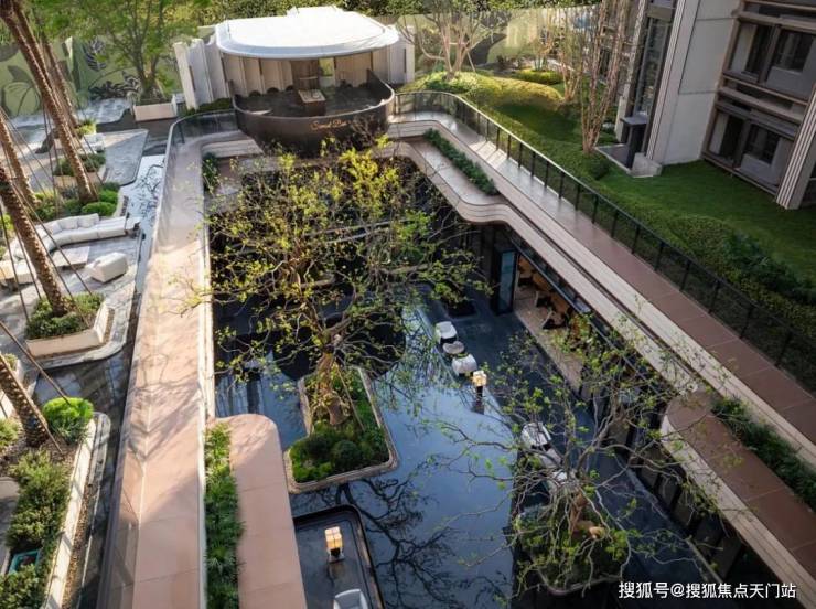 实景呈现的岛屿水院,作为保利天奕五座全球大师花园之一,在 银海枣树阵、 下沉式庭院、 镜面池畔卡座的呼应中,成为未来居者沉浸自然的惬意之地。温柔闲适的 落日廊吧,犹如身处海岛之畔,感受蓝调时刻的优雅情调。