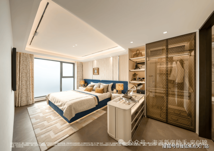 108户型主卧,连通阳台后,整体空间感媲美130㎡大三房的主卧尺度,在放置1.8米大床+双床头柜后,还能定制一个大尺寸L型衣柜。