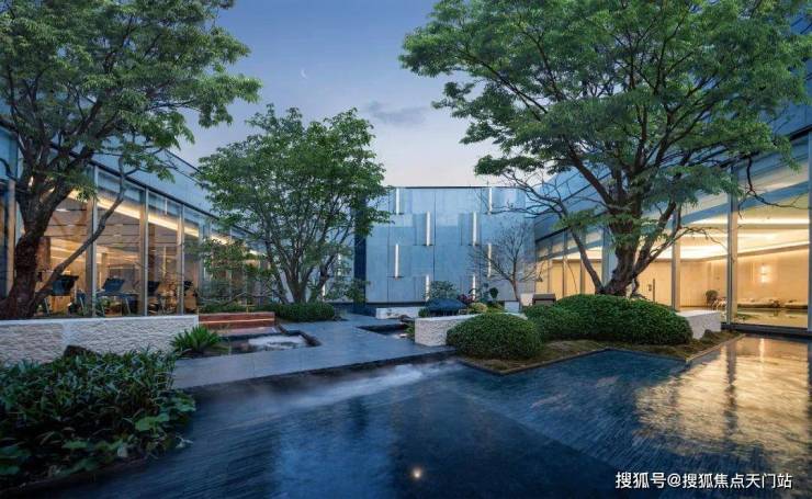 会所还拥有 下沉水景庭院,与周围建筑融为一体,以静水、原石、浮桥、古树、自然微地形为精神媒介,将自然与松弛感带给社区。