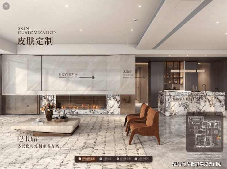 比如皮肤定制,墙面、地面、全屋柜门均提供 多材质多配色 可选,客厅背景墙、岛台亦有多种石材方案自由搭配;