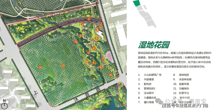 整座公园(在建中)划分为:湿地花园区、鸣湖共享区、林荫跃动区和社邻园艺区,四大功能分区。
