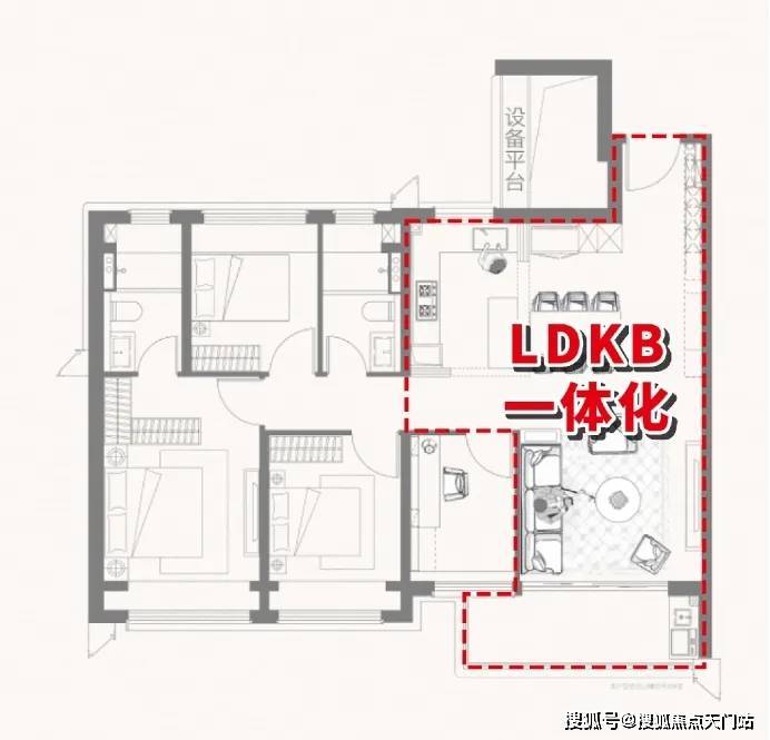该户型还制定了LDKB一体化空间规划,厨房、餐厅、客厅三大空间联通,打造一个可以让家人之间交流更为频繁的“家庭核心区”,促进日常互动交流,让家人更亲密,让陪伴更温馨。