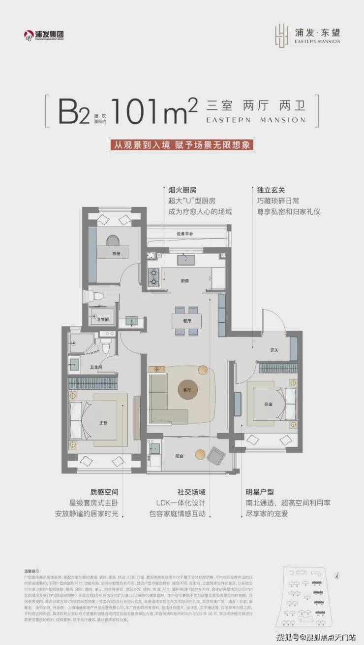 建面约101㎡B1户型尺度感惊人,约5.2米南向面宽的客餐厅以及阳台,为室内带来了非常出色的采光度。