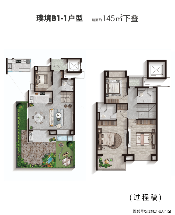 另外,还可以选择B2-1户型建面约145㎡下叠,面积上与B1-1户型相同,功能区也大致相似。