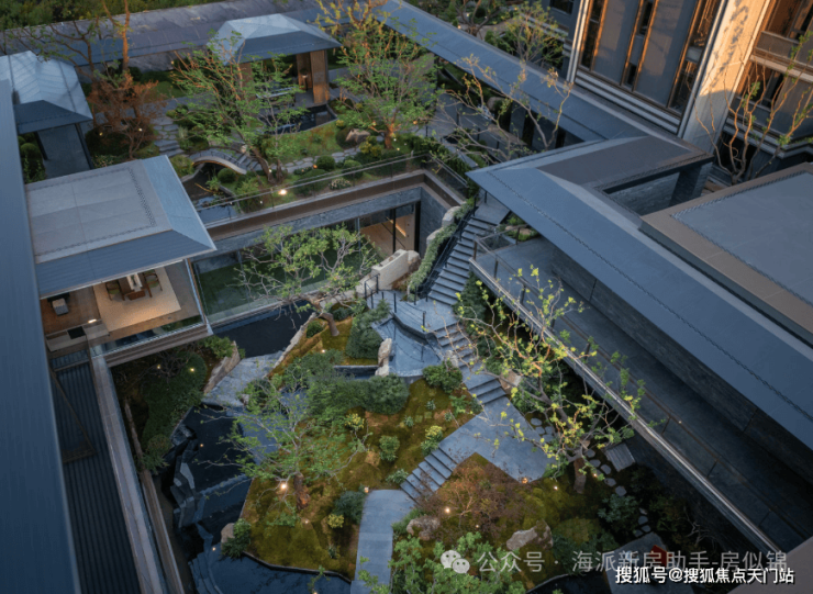 再往里走就是近460㎡的下沉式庭院,精选太行山金景石堆叠成小山丘,引进溪水汇聚成池塘,并移栽岭南珍贵的古桩铁冬青和中华原生乌桕树,形成一幅立体山水画卷。