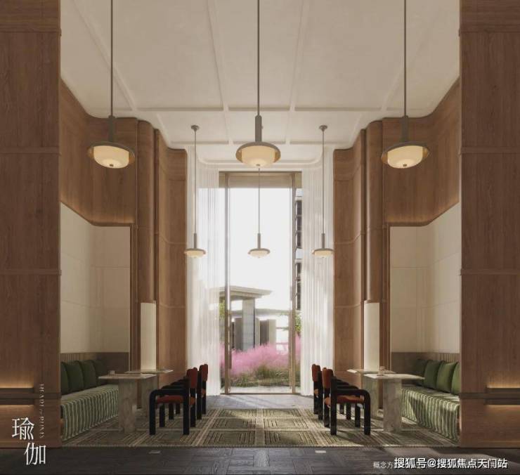 项目235新品户型方正规整,格局圆满;270°边厅设计,三面采光,五根结构柱的巧妙布局创造出极致的窗墙比与全落地玻璃幕墙,将中心园林的绿意与下沉庭院的景致最大化引入室内。