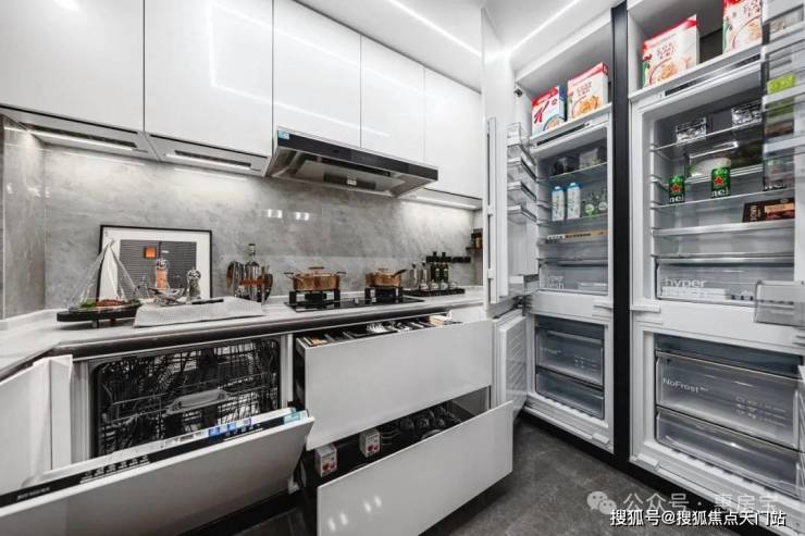 入户后, 所有玄关柜均为交付标准,还精心配置了“除臭精灵”,下方更预留了扫地机器人的空间,为日常起居提供便利;像传统的豪宅三大件,项目采用大金品牌中央空调地暖两联供,以及格兰斯柯的新风。厨房空间,甄选西门子新款的抽油烟机、灶具、洗碗机等,甚至连大部分项目不配备的冰箱也是交付标准;还特别配置了轨道插座、前端净水器和凉霸;吊轨金属玻璃移门,既美观又方便清理。