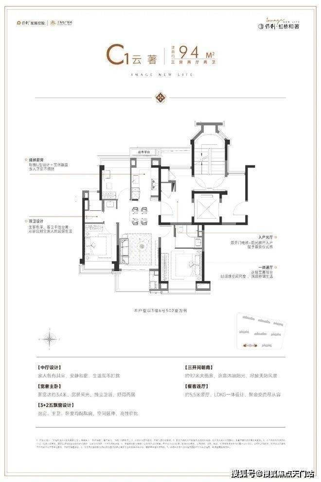 建面约94㎡的三房户型,飞机户型南北通透,还有约5.5米竖厅和LDKG一体设计,整体空间感十足。
