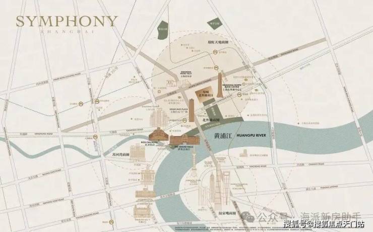 尊踞上海北外滩之心,与陆家嘴天际线从容对望。 项目直线距离黄浦江岸仅约900余米 (来源百度地图) ,坐揽北外滩中央公园生态绿肺 (规划) 及百年外滩人文画卷, 是外滩新百年时代无可争议的封面作品。