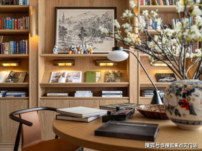 多功能书架彰显着设计的巧思,形成有如博物馆般的展示方式,即可放置日常读物,亦可展示珍本藏书。同时,利用屏风做隔断,与圆桌结合形成私密空间。