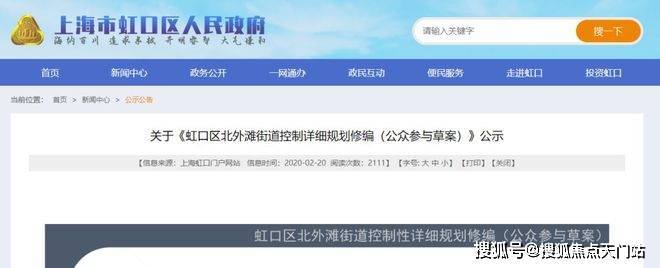 2020年2月20日公示了关于《虹口区北外滩街道控制详细规划修编(公示参与草案)》。