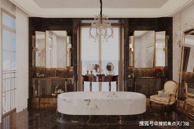 秩序,是主卫浴空间布局的重点。两个独立台盆相对而立,分属男女主人,营造出从容自如的使用体验。大面积运用黑白撞色大理石,让空间的秩序美与材质的自然美融合,颇具观赏韵味。