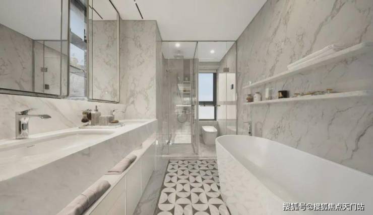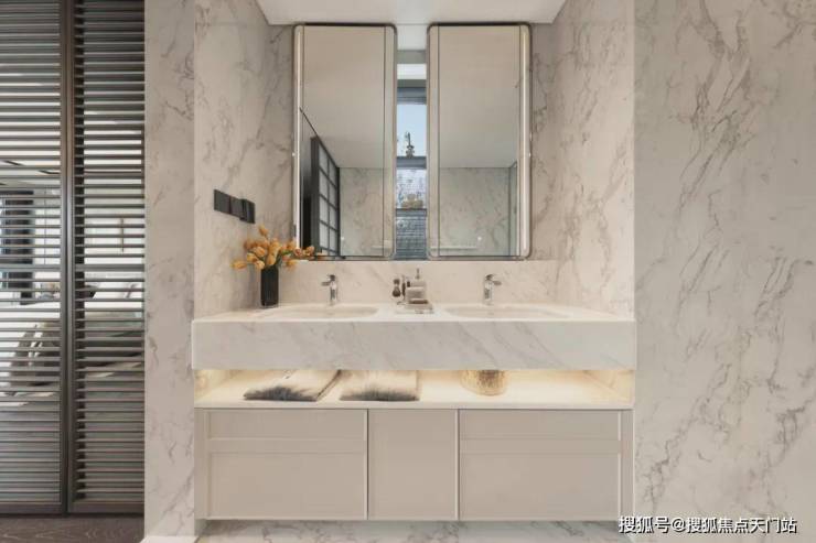 此外,室内还大量运用 雅士白大理石、大花白岩板、皇家孔雀岩板、水纹夹丝玻璃、仿洞石岩板、卡拉卡塔白岩板、灰色皮革 等定制材质,以华润置地独有的“五奢体系”,彰显着对高品质生活的极致追求。