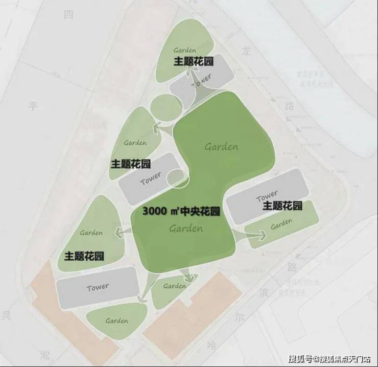 社区景观上,突破市区项目常见的「兵列树阵式」布局,通过建筑楼体的精密偏转,形成罕见的围合式社区形态。