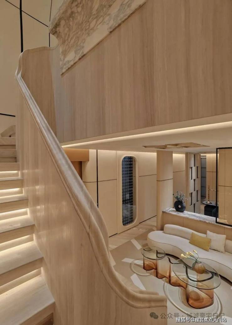 顺着弧形木质楼梯抵达地下空间,仿佛游走在一曲流动的乐章中。一切都共同呼应着水的特质,传递着低调隐逸情怀与圆融个性。