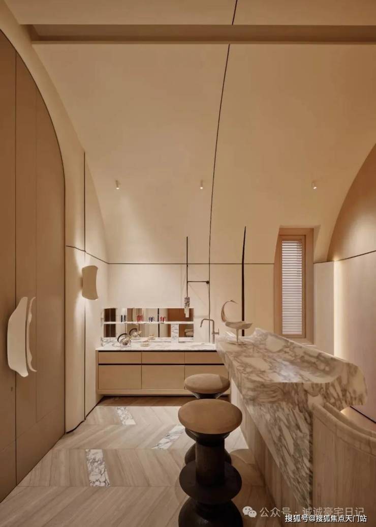 顶层专属于主卧,推开双开门,拱形天花设计尽显浪漫,挑高至3.8米,一条长灯带自浴室贯穿至整个卧房,分置于灯带两侧的弧形结构,环抱出一份安心。而其床头背板也被设计成拥抱的视效,为空间增添温暖包裹的氛围。