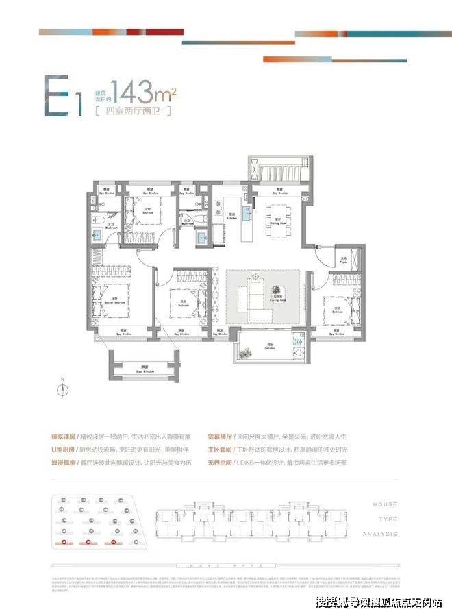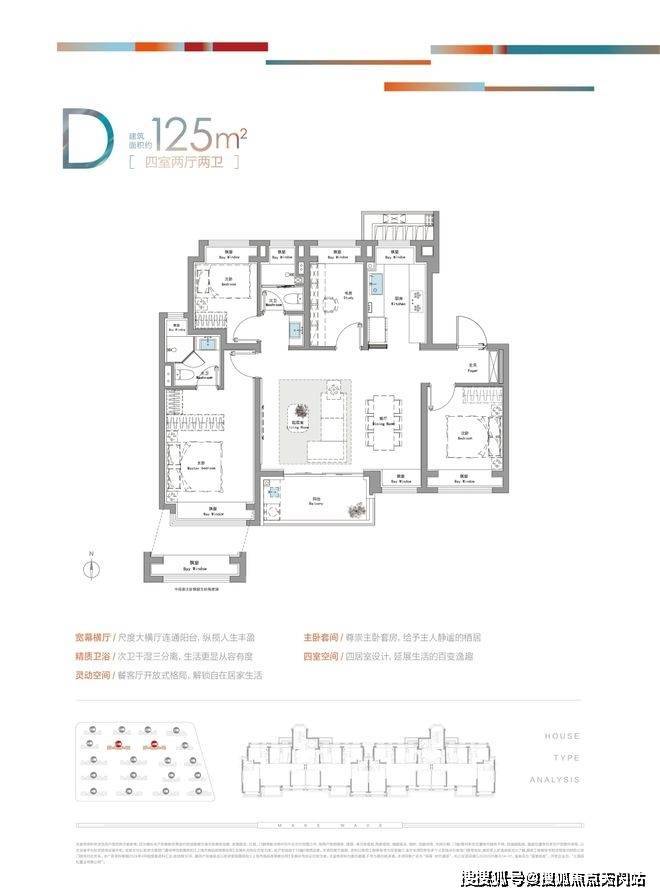建面约125㎡的四房户型,拥有超大尺度横厅连通阳台,四开间朝南+主卧大套房,给予业主不输千万豪宅的居住体验!