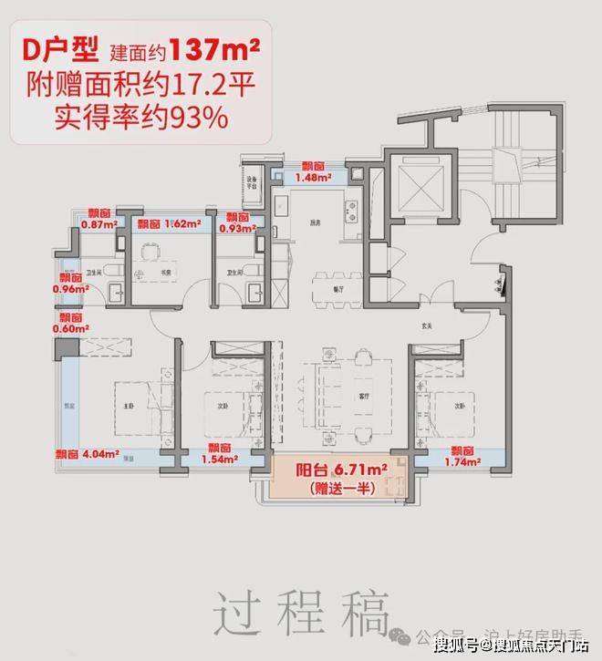3、空间升级:超配双270°飘窗格局!市面上很少会有主卧及书房均设计270°飘窗的百平户型,稀缺性不言而喻~