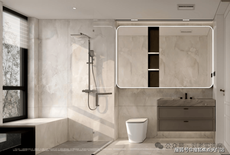 配备美妆龙头,大容量镜柜可收纳洗漱用品,利用墙面空间设置壁龛,便于存放毛巾、衣物便于取用。