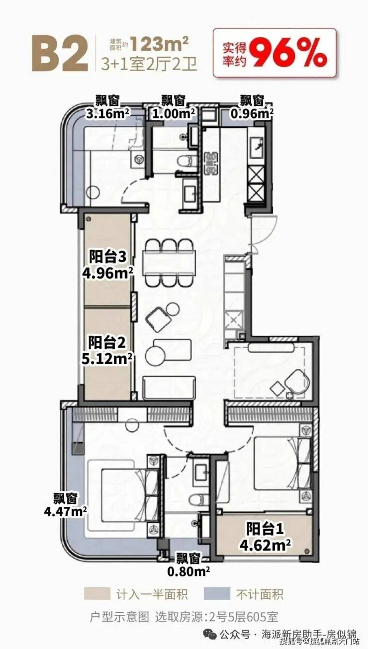 建面约123㎡4房,三阳台面积达约14.7㎡(赠送一半),5飘窗赠送高达约10.4㎡,室内使用面积约117.8㎡,实得率高达约96%,总赠送面积相当于两个次卧。