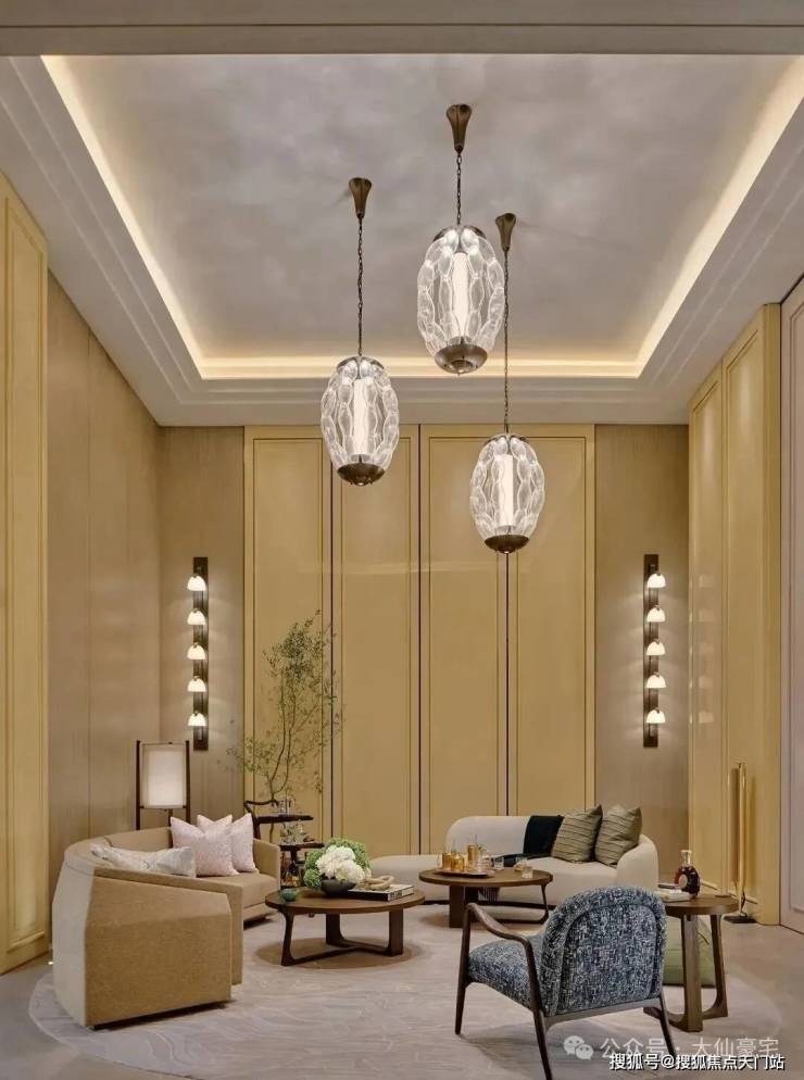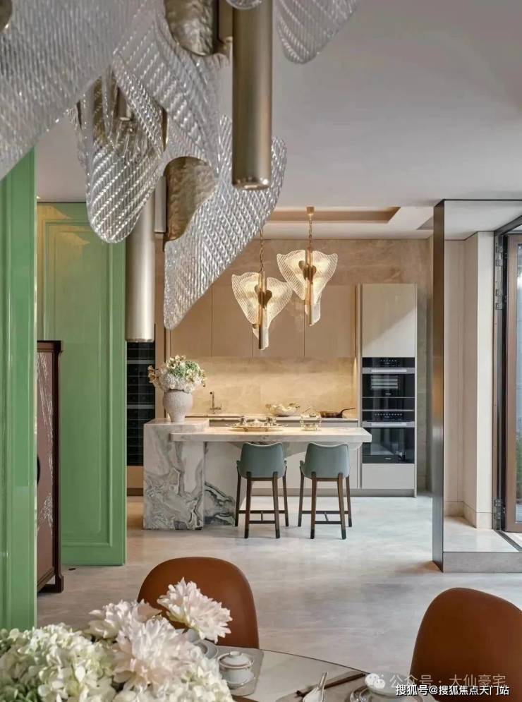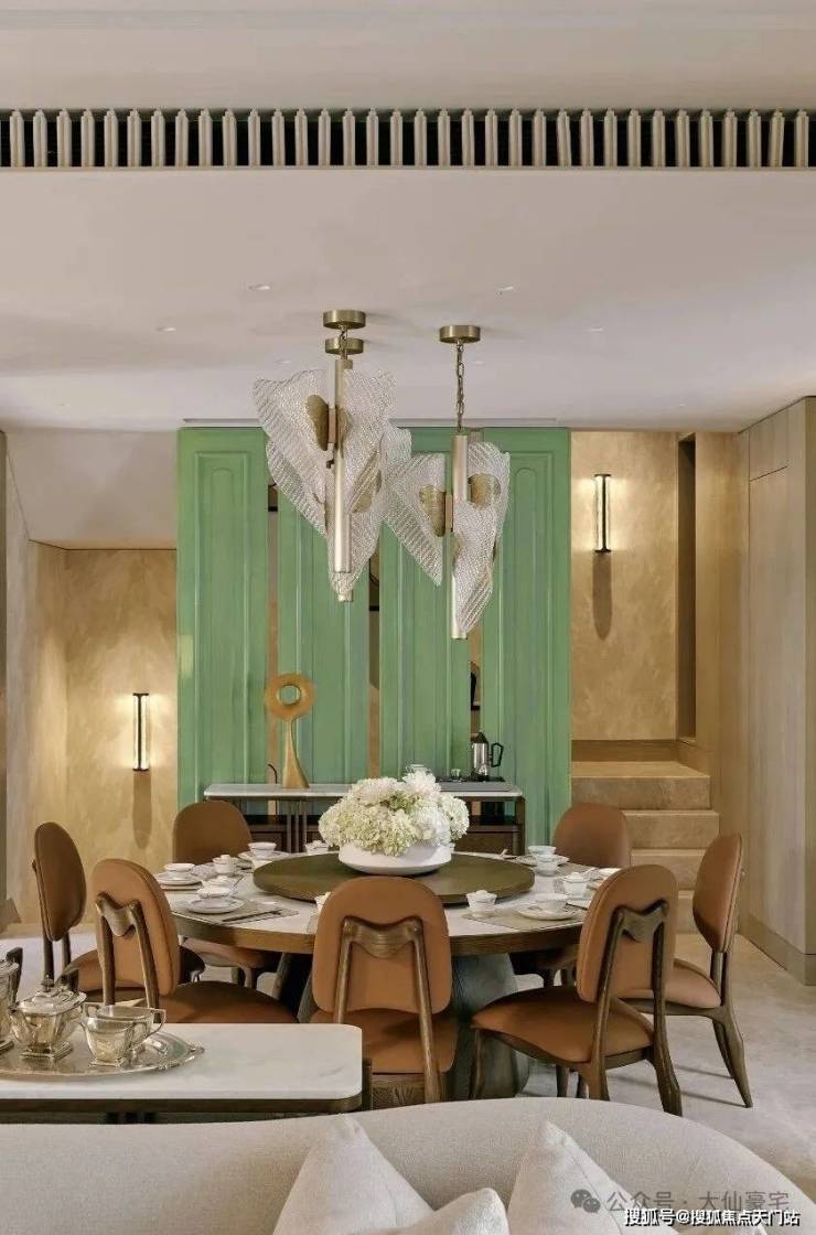 顶层下午茶区以淡绿为底,壁炉暖光漫过手绘地毯的肌理,将社交场域沉淀为冥想容器;主人房墙面缟玛瑙(Onyx)的天然流痕,也与一层屏风暗纹形成时空对位,光影在矿物晶体中生长出私密的诗。