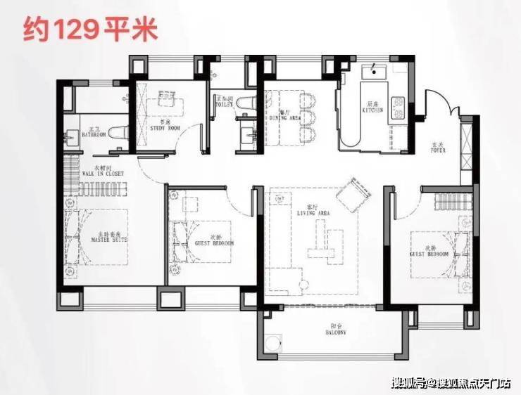 户型采用动静分离设计。三个卧室和一个书房都有大面积飘窗,空间感更强,利用率也更高。厨房操作空间大,次卫采用干湿分离设计,实用性更强。
