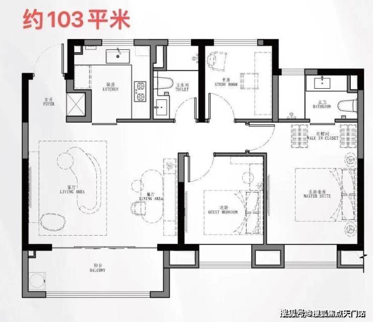 107㎡是103㎡户型的PLUS版,厅面宽达到5.5米。汲取了103㎡户型所有的优点;如餐客厅一体,U型厨房,动静分离设计,大尺度主卧套间,以及每个卧室都赠送大面积飘窗。