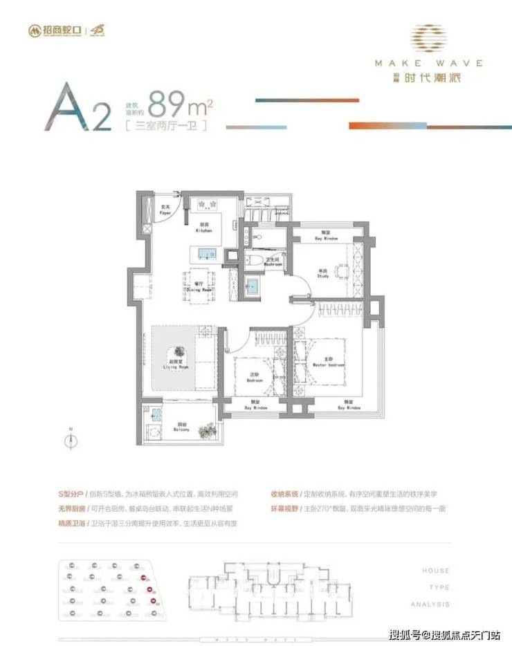 建面约89㎡3房户型:东边套主卧配置约270°双向采光飘窗、S墙设计,主力总价仅约450万级,首付约90万起!