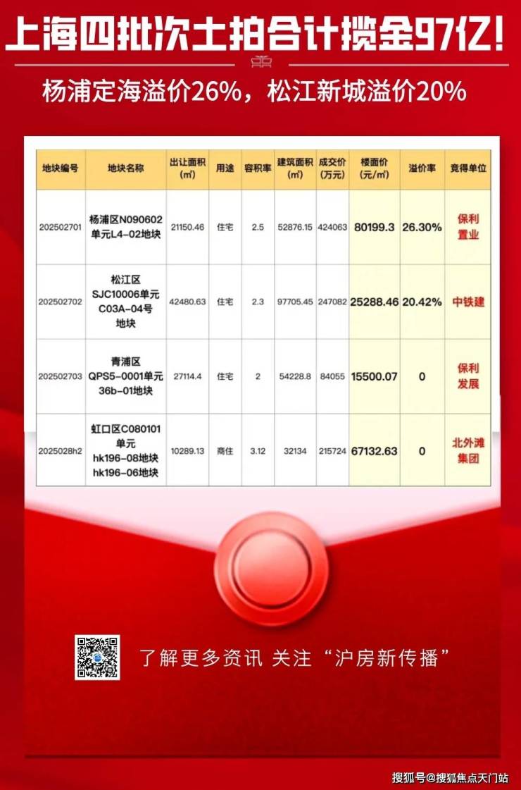 2024年1月10日,经过56路竞价,最终招商以52.5亿摘下松江区泗泾镇SJS20005单元14-01、16-02、17-07号地块,地块位于9号线泗泾站北侧,出让面积129624.71㎡,房地联动价51100元/㎡。