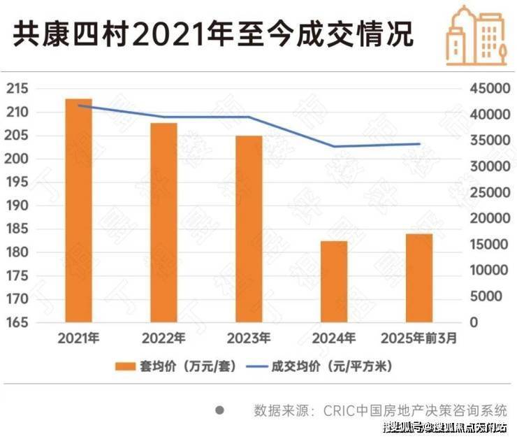 CRIC数据显示,2021年至今共康四村成交均价从41782元/平方米跌至34386元/平方米,跌幅达17.7%,套均总价从212.89万元/套跌至184.04万元/套。