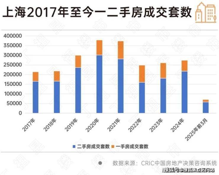 CRIC数据显示,2017年至今,上海一二手房成交套数的比值一直在1:3左右,也就是说每卖1套一手房就有3套二手房成交。从成交套数来看,二手房占据绝大多数。与此同时,虽然一手房经常出现较高成交价格,但上海二手房套均总价一直在300多万元/套,2025年一季度上海二手房套均总价为352.56万元/套。