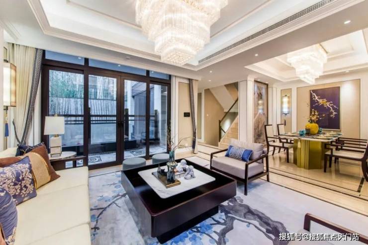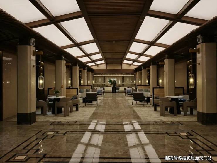 通过优化后的“L型”空间排布,实现了三面有园林环绕,前庭空间尺度非常大,一进门就是约10.2米的大横厅,气派十足,采光也做到极致,日常起居极为从容舒适。