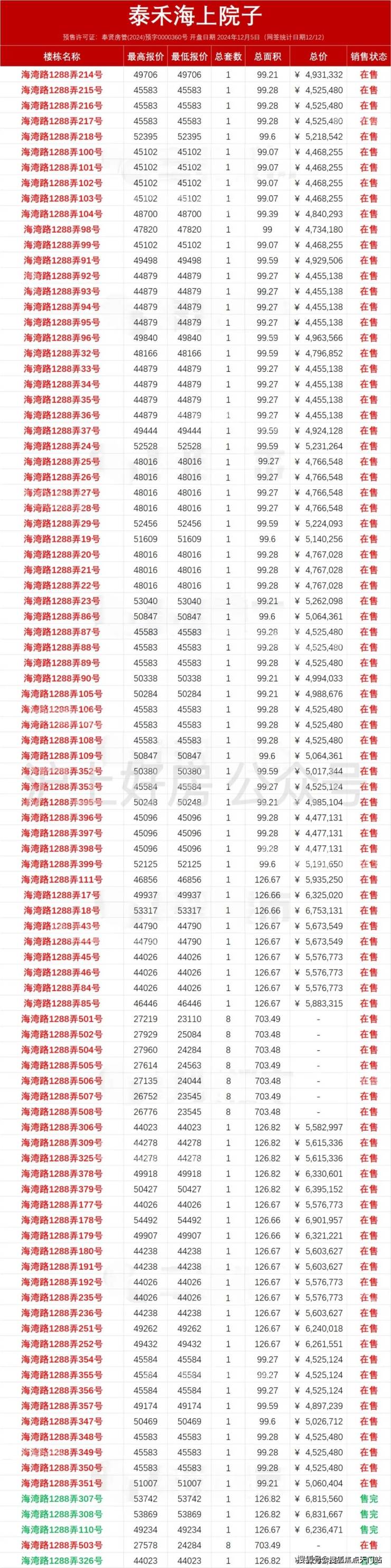 根据公示,泰禾海上院子已经于2024年7月4日取得预售许可证至今分三次开盘销售,总套数591套,已售315套。剩余276套在售(信息来源上海房地产信息网) 三批次6月27号取证,7月16号开盘,目前可以直接认购。
