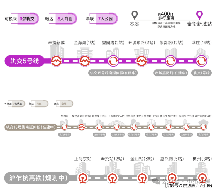 交通方面:项目多轨交环绕,5号线、15号线南延伸段(在建中)、市域嘉闵线南延伸段(规划中)、沪乍杭高铁(规划中)及南枫线(在建中)