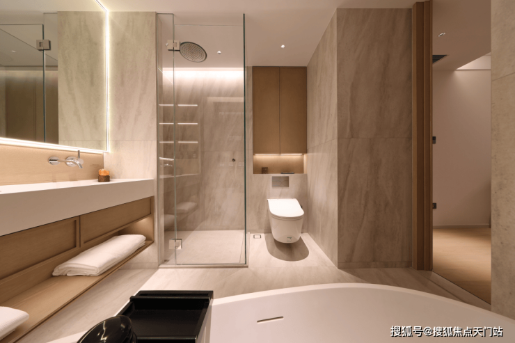 主次卫内的水龙头,也都配置了德国当代Dornbracht的墙出式水龙头,墙出式水龙头的采购成本要高于同等品牌的台面龙头。与龙头搭配的,是设计师定制的极简风的双台盆一体化洗漱台和独立式浴缸。