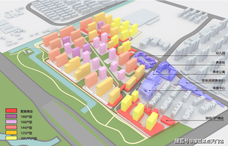 【天安1号】总用地面积17.88万㎡,由住宅、体育中心、养老公寓、养老院、幼儿园、商业组成。