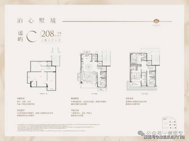 ,专属于待客与家庭欢聚;楼下为静谧休息区,确保家人生活互不干扰,呵护隐私。 三间卧室均配备独立卫生间,全套房设计充分尊重每一位家庭成员的私密与舒适,彰显人文关怀。 层高约5.8米、带采光井的地下空间,也是上叠的点睛之笔。自然光线柔和渗入,毫无压抑之感。可根据您的喜好,打造为私人影音室、雅致藏酒窖或宁静冥想室——这是一个完全属于您的“第三空间”,也是逸庐奉献给生活的又一份惊喜。