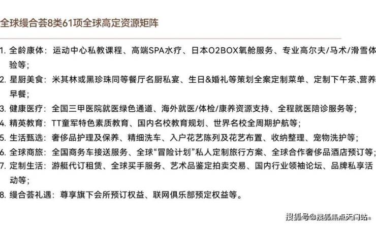 并链接8类61项全球尖端资源,从运动、教育、旅行、医疗等多维度,可谓把全球一线资源与全新生活方式注入古北99,对标国际高端生活标准。古北99售楼处预约热线:400-118-3159☎️☎✅✅✅《售楼处已认证》