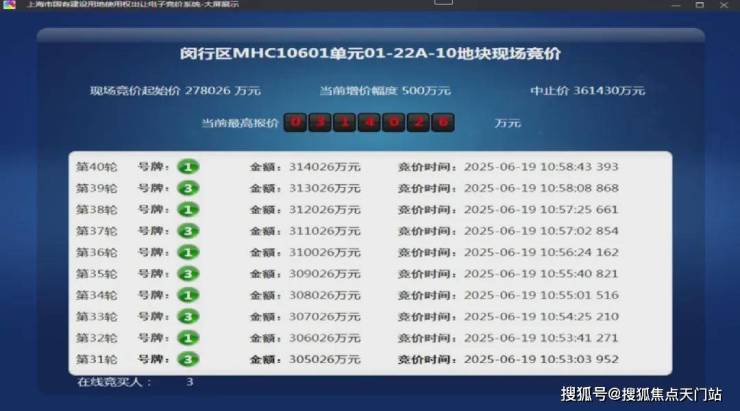 6月19日,闵行1幅地块出让,地块名称为颛桥镇MHC10601单元01-22A-10地块,规划用地性质为住宅用地,出让面积4.05公顷,容积率为2。经过40轮竞拍,最终由上海保利城市发展有限公司竞得,总成交价314026万元,溢价率12.95%。