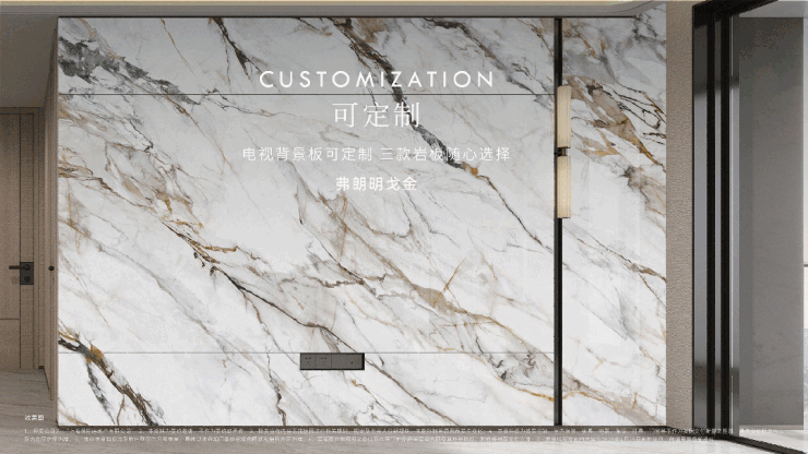 充分考虑业主的个性化需求,在电视背景板提供了 新潘多拉、云中翡翠、弗朗明戈金 三种结晶釉面岩板选择,成本更高,施工难度也更大。