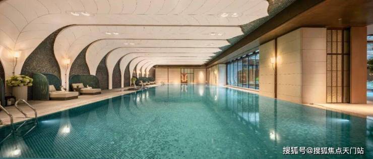 恒温泳池 :第一,采用了景德镇烧制的陶瓷马赛克,独特的釉面色彩由景德镇老师傅手工浇筑而成,充满人文艺术底蕴;第二,羽毛天花造型,由600余件铝板打造,表面采用了仿贝壳纹的艺术漆处理,带来松弛度假感;第三,不仅配置了约25m×10m的4道泳池,还采用了奥运会同款空调除湿系统,彰显高档品质细节!