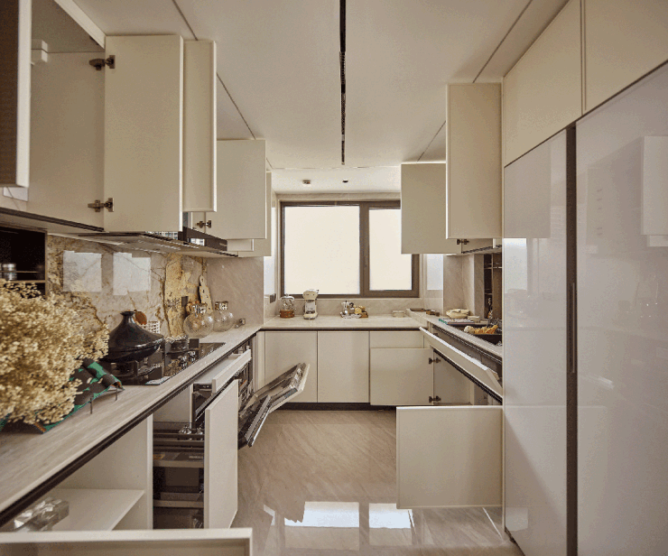 譬如说部分柜体更安全的 圆角处理 、高柜顶部一窥到底的 镜面反光膜 、大大提高空间利用的 薄抽 ,不用弯腰一踢即开的 踢脚抽 设计,便利性大大增加;每一个细节都充分考虑到了未来居住的舒适性,这种产品颗粒度真的令人惊艳!