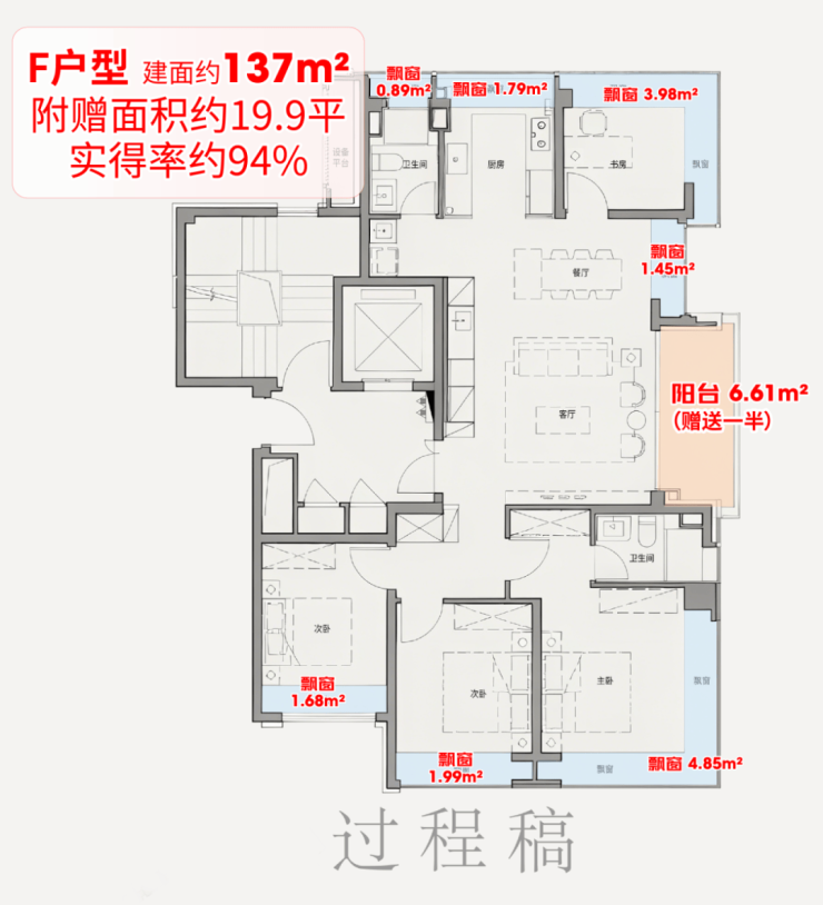 F户型7飘窗,总赠送面积约19.9平,实得率约94%;