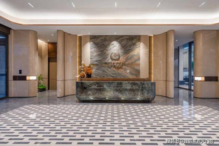 迎宾大道的两侧,浅米色的仿石材景墙与大堂入口遥相呼应,纯净的质感、古铜色的装饰、简约的线条,搭配着酒店式的雅奢之境,创造出优雅、静谧又松弛的体验。而精致细腻的金属护栏、定制化的地面铺装、内嵌式的灯光照明等细节,将度假感、雅奢感和艺术感高度浓缩在每个日常生活场景中。