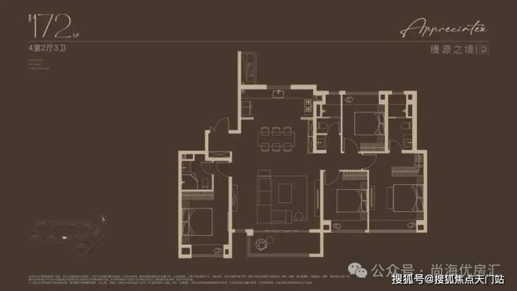 建面约172㎡4房户型,多娃家庭的进阶之选!奢阔尺度尽显家族气度!2梯2户, 子母双开门礼序入户,私密尊崇门厅;约16米四开间朝南,搭配约6米尺度横厅,揽四时风景入怀。