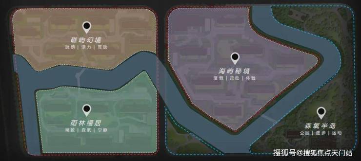 第一,项目由两条天然水系穿流而过,形成三座天然“岛屿社区”,开发商在三座“岛屿”设置不同主题,并铺陈丰富的景观节点。