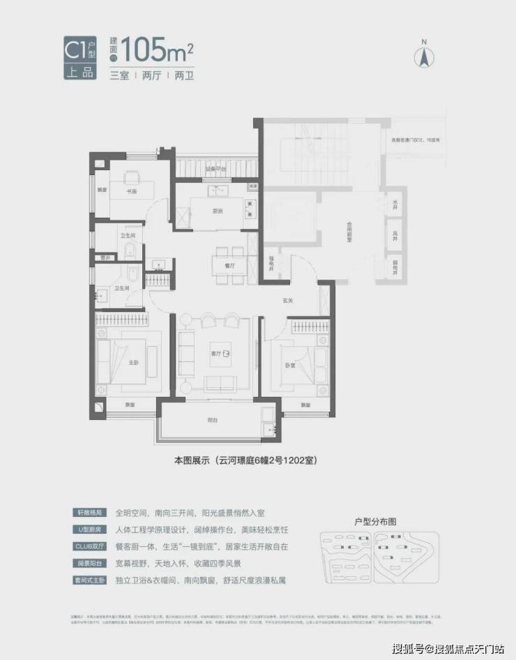 首先是建面约105㎡3房边套,飞机户型,客餐厅阳台厨房一线联通,南北通透。