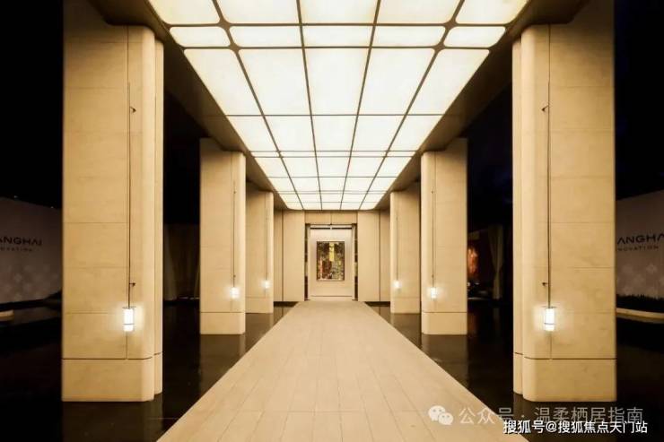通过迎宾楼,便来到了约20米长的精神游廊 ,该精神游廊同源招商玺 “树宅相守”的设计手法,更致敬建筑诗人斯卡帕“以自然光感去创造时间驻留感”的理念 ,通过对光线、材质与空间的创新打造,营造充满宁静的归家场域。